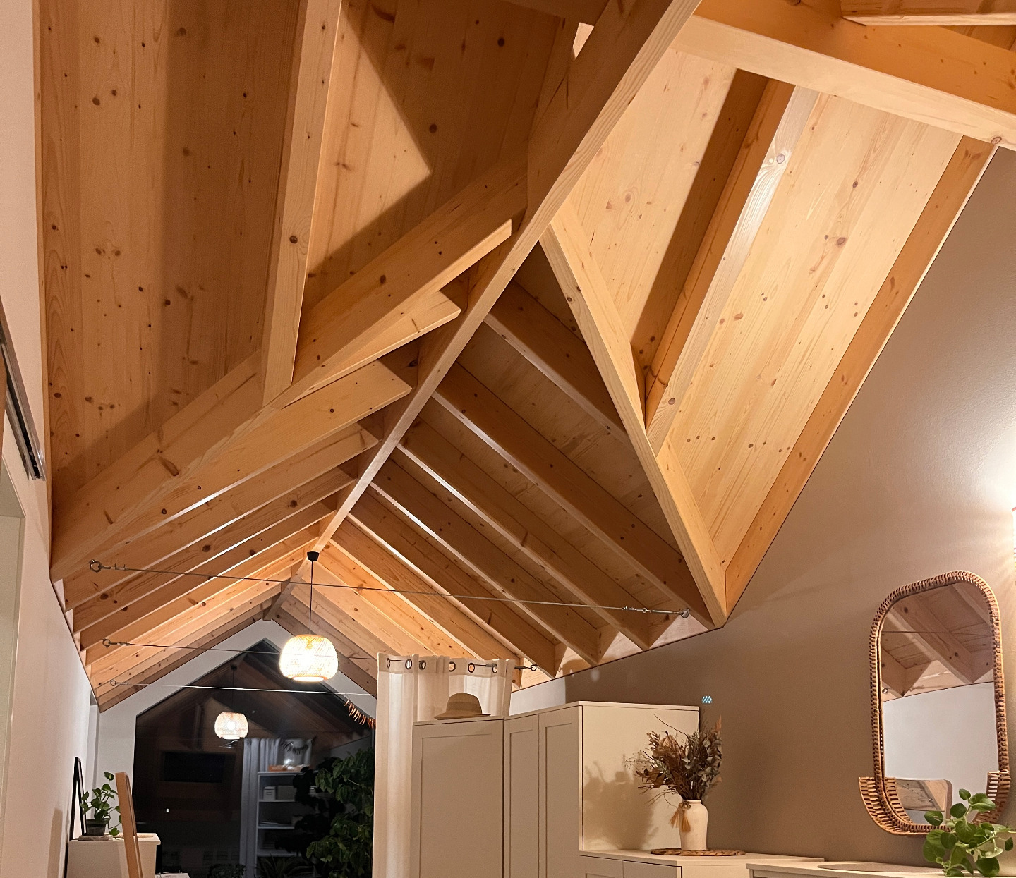 Konstrukce krovu je zajímavá právě díky požadavku památkářů na složitý tvar střechy a vytváří v interiéru jedinečnou hru světel a stínů.